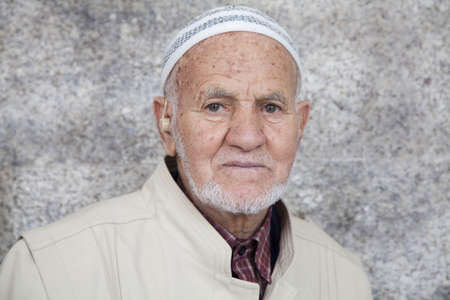 Caceres, Spain - April 22, 2011: portrait of a man with wrinkled face of Arab origin with typical cap called taqiya, staring into the camera, posing on gray wall background