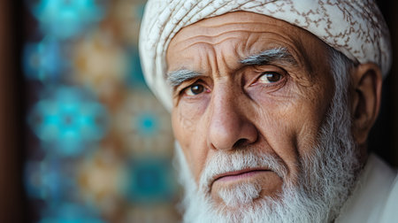 An elderly man with a thoughtful expression gazes into the distance, surrounded by intricate patterns and vibrant colors. His wise demeanor tells a story of a rich life lived.