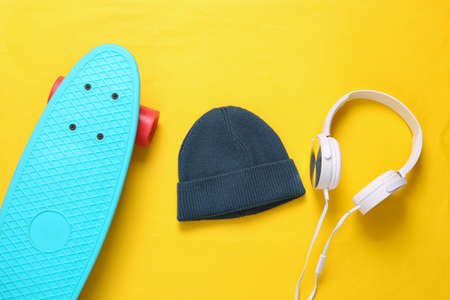 Beanie, headphones and penny board on yellow background. Youth, hipster still life. top view. flat lay
