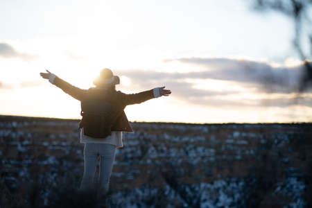 Happy young hiker in the Grand Canyon National Park at sunset