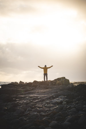 Young traveler walks along a rocky beach during a breathtaking stormy sunset in western Iceland, enjoying the last rays of sunlight. Dramatic sky and soft Arctic light.