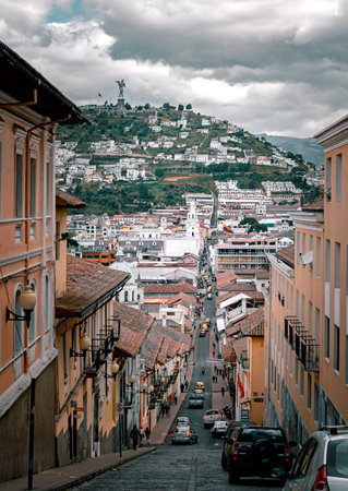 Beautiful panoramic view of colonial town with some colonial houses located in the city of Quito and panecillo Virgin in the horizont located in the city of Quito.