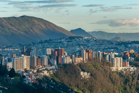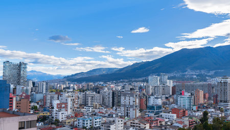 Day urban scene photo of modern buildings and big mountains at background in a district of Quito city, the capital of Ecuador in South America
