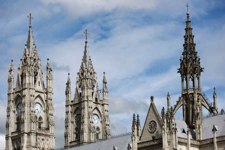 Basilica del Voto Nacional, a church in the centre of Quito, Ecuador. Visible both belltowers of magnificent church in an urban south american environment