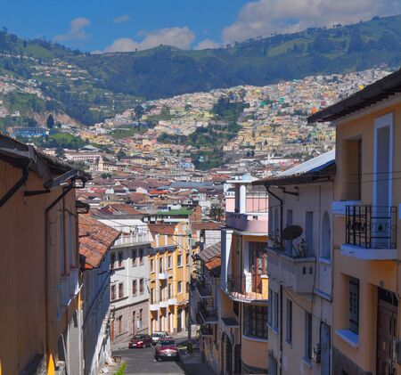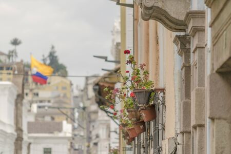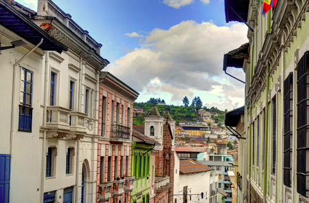 QUITO, ECUADOR - MAY 06 2016: Beautiful view of the colonial town with some colonial houses located in the city of Quito