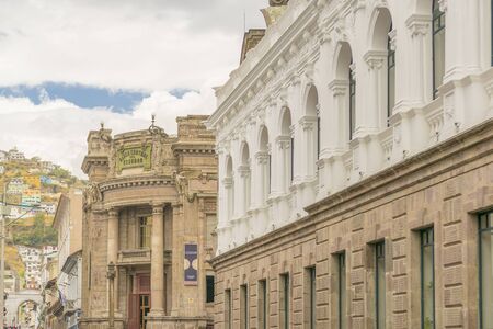 Low angle view of neoclassical style buildings at the historic center of Quito in Ecuador.