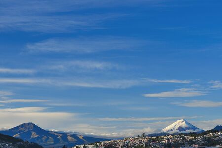 The city of Quito surrounded by the Sincholagua and Cotopaxi volcanoes