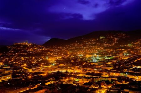 Beautiful night view of Quito mixing new architecture with charming streets, with a panecillo turist place in the mountain in front, in the city of Quito