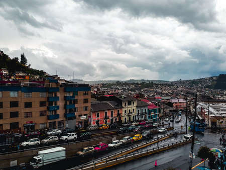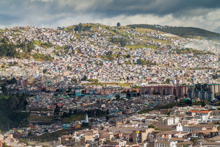 High view of Quito, from the Panecillo hill, on a cloudy and overcast afternoon. Quito, Ecuador.