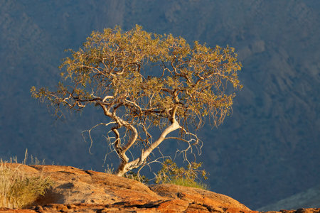 A tree on the ledge of Sesriem Canyon, catches the last rays of the setting sun. Sesriem area, Namibia, around sunset.