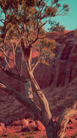 A stunning tree rises amidst the red rock landscape, catching the warm glow of the setting sun. The majestic surroundings create a peaceful atmosphere full of natural beauty.