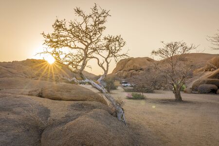 Camping life at sunrise in the Spitzkoppe National Park in Namibia in Africa.