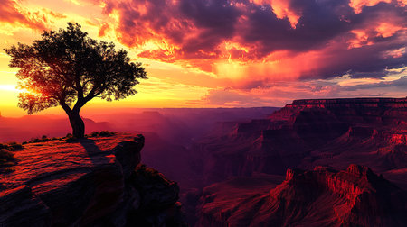Breathtaking 3D Render of a Grand Canyon Sunset with a Lone Tree on the Cliff Edge