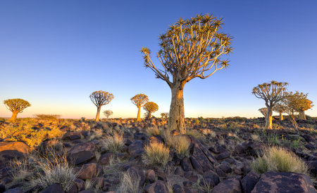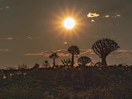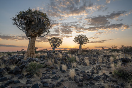 Landscape of quiver tree forest near Keetmanshoop in Namibia at sunset