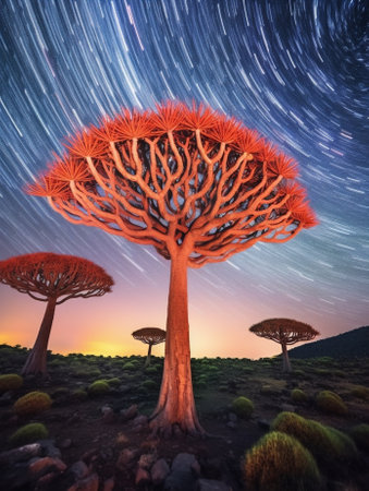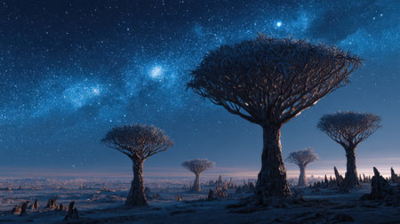 A breathtaking scene presents unique trees silhouetted against a starry sky creating a magical atmosphere.