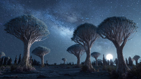 Beneath a starry sky unique trees stand tall in a tranquil scene illuminated by the bright moon.