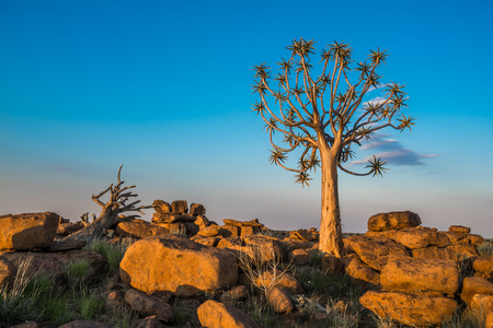 Desert landscape at sunrise with granite rocks and a quiver tree (Aloe dichotoma), Namibia