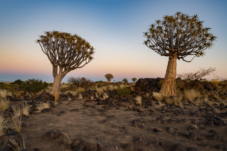 panorama. Quiver trees or aloe dichotoma in quiver forest at sunset, Kitmanshoop, Namibia. africa