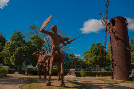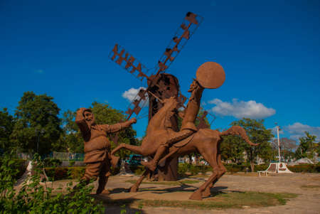 Monument Holguin, Cuba: statue of don Quixote on horse, Sancho Panza and mill in the Park