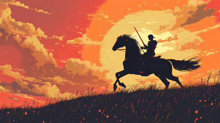 A solitary rider gracefully sits atop a horse as they traverse a gentle hill. The sunset casts a warm glow, creating a striking silhouette in a serene landscape.