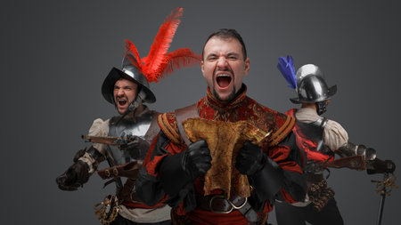 Violent captain conquistador with map and two soldiers