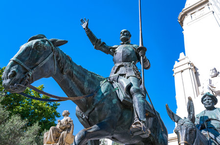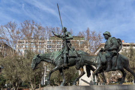 MADRID, SPAIN - JANUARY 23, 2018: Monument to Cervantes and Don Quixote and Sancho Panza at Spain Square in City of Madrid, Spain