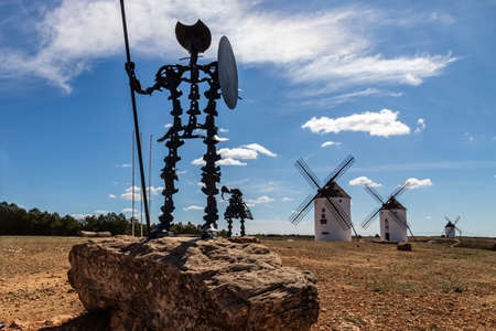 Statue of Don Quixote in La Mancha next to old stone and white windmills. Spain. Europe.