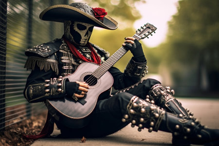 Studio portrait of mexican mariachi in deadman attire Indoor photo of male model with zombie makeup playing guitar : Generative AI