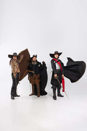 Full-length portrait of thee brutal men in vitage costumes with swords, musketeer and pirate isolated over white background