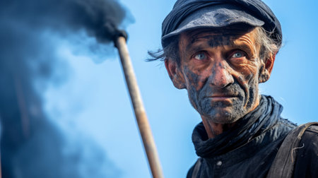 Close-up portrait of resilient chimney sweep covered in soot holding chimney brush with dark ashes