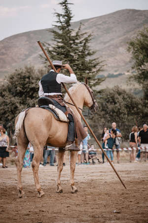 rider on his horse, performing dancing and dressage with him, in exhibition held in the town of Serranillos, Avila, Spain, on August 31, 2019