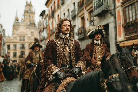 In 1710 Charles of Habsburg rides into Madrid showcasing opulent attire and symbolizing Habsburg heritage. His entourage embodies the grandeur and drama of royal history in the vibrant city.