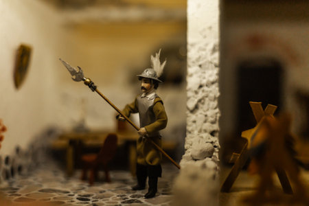 Miniature scenes inside a medieval castle showing figurines of knights, peasants, and nobles in daily life. Artistic staged display symbolizing history and craftsmanship.