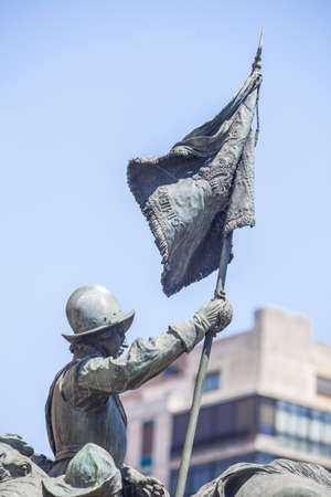 Valladolid, Spain - July 18th, 2020: Memorial to Cazadores de Alcantara at Facade of Cavalry Academy of Valladolid, Spain. Sculpted by Mariano Benlluire in 1931