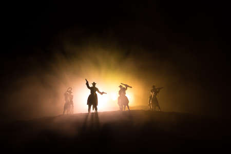 Western concept. Battle between cowboys at night. Duel to the death. Creative artwork decoration on toned foggy background in selective focus