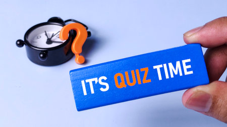 It's Quiz Time: Blue Block with Text, Clock, and Orange Question Mark Symbol for Education, Challenge, and Concept