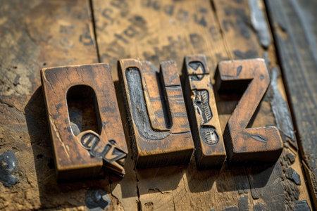 \The word \\Quiz\\ written in vintage letterpress type on a grunge wooden background.\