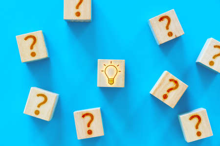 problem and solution. wooden cubes with question marks and a cube with a light bulb symbolizing an idea
