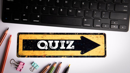 Yellow Arrow Sign with Word Quiz on Desk with Keyboard and Pencils Representing Online Learning and Education Concept
