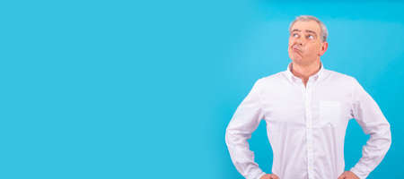 Choice problem. Puzzled man. Confusion idea. Thoughtful handsome guy in casual t-shirt pondering holding hand on chin isolated blue copy space.