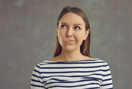 Embarrassed young woman pursing mouth. Lady looking away. Bewilderment concept. Isolated front view on white background.