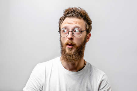 Funny surprised millennial caucasian man with stubble in white t-shirt with wide open eyes looks at camera