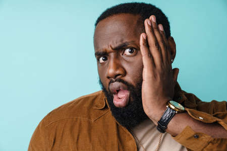 Photo of young black man negative moody think look empty space isolated over turquoise color background