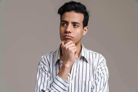 Brunette hispanic man in shirt posing and looking aside isolated over grey background