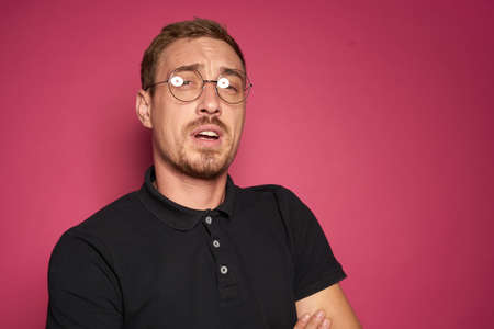 Worried and uncertain young man in casual clothes and glasses looks pensive. Concept Portrait, Emotions, Uncertainty, Casual, Eyeglasses