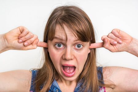 A young woman covers her ears from the noise. Emotion of discontent and irritation on the face. isolated.