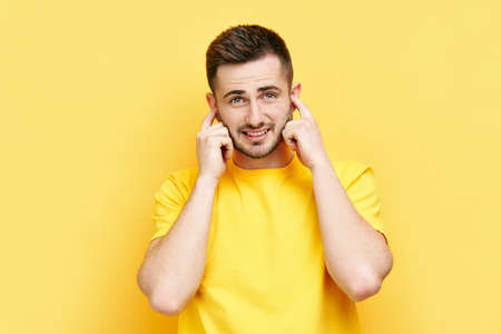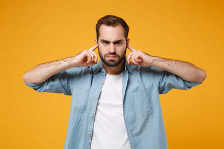 Displeased young bearded man in casual blue shirt posing isolated on yellow orange wall background studio portrait. People emotions lifestyle concept. Mock up copy space. Covering ears with fingers.