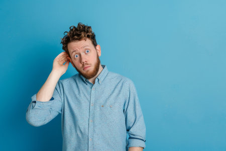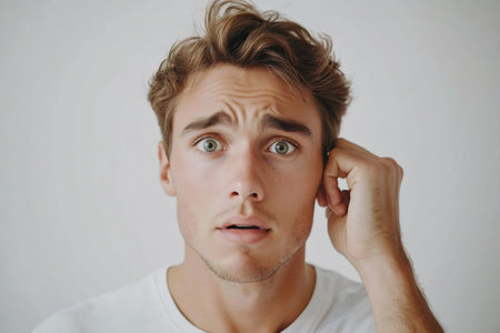 Young man holding hand to ear, listening intently with surprised expression, showing curiosity and attention