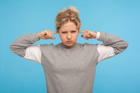 Don't want to hear! Irritated woman in grey sporty sweatshirt covering ears and puffing out cheeks, looking naughty and angry don't listen, ignoring annoying noise. indoor studio shot, blue background