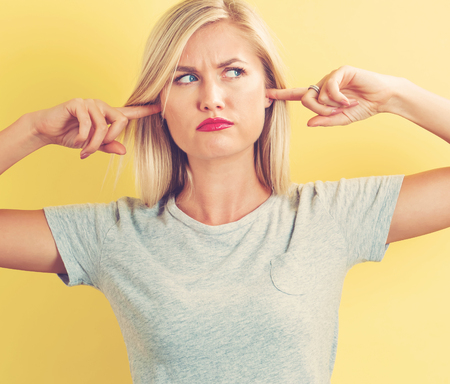 Stop making this annoying sound. Unhappy stressed out young woman plugging ears with fingers